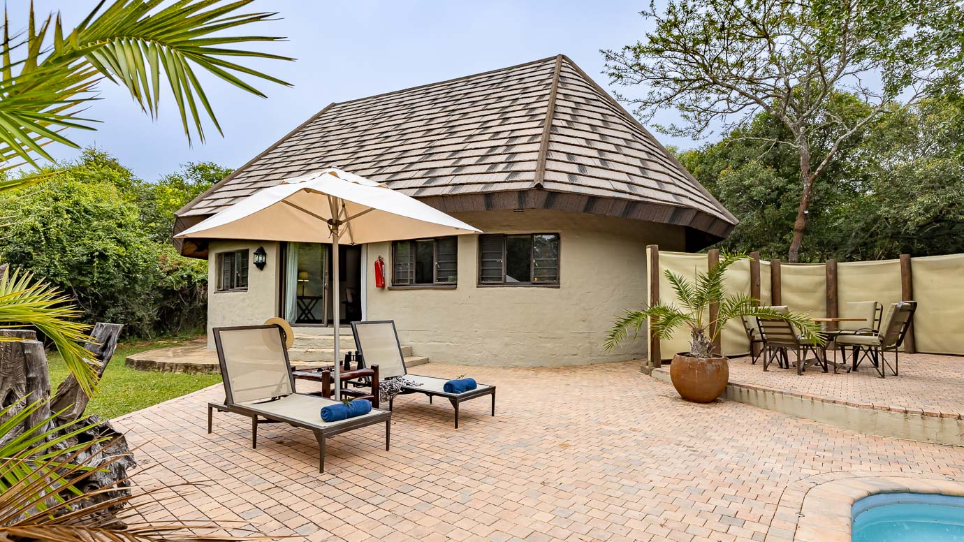 Two of our oldest villas based on the typical hunter’s lodge design. Two bedrooms en suite offer space and comfort to our guests. Thatched ceilings add to the nostalgia of the past creating an old-world charm. Nyala buck often frequent the lawn grazing during the day. A large private pool offers a tranquil setting for relaxation.